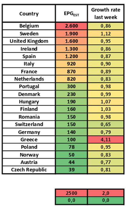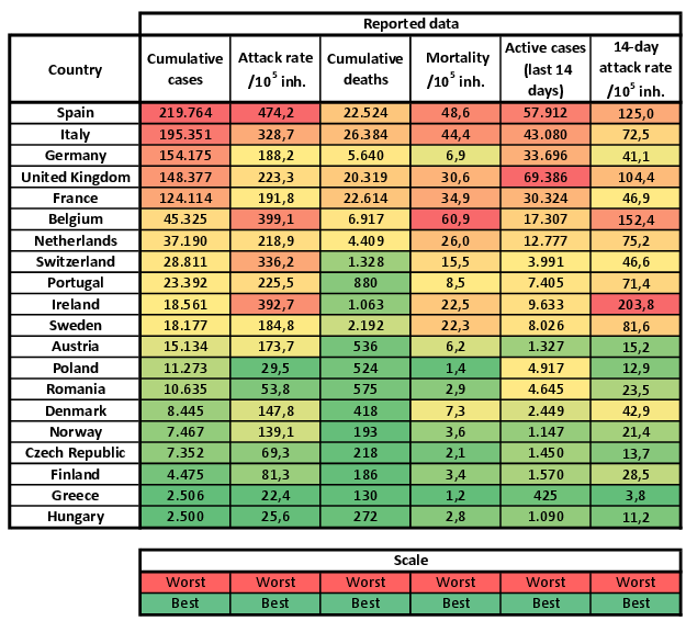 With the exception of Belgium, which includes deaths that are probably not from COVID-19 in the figures for the disease, the rest of the countries report deaths from COVID-19 in a reasonably similar way, following the criteria of the European Centre for the Prevention and Control of Diseases (ECDC). This means that it is possible to compare the real situation from the mortalities in the different countries, over and beyond the first impressions from the data. If we look at the total number of cases (Table 1), Spain and Italy continue in the lead for registered cases.
