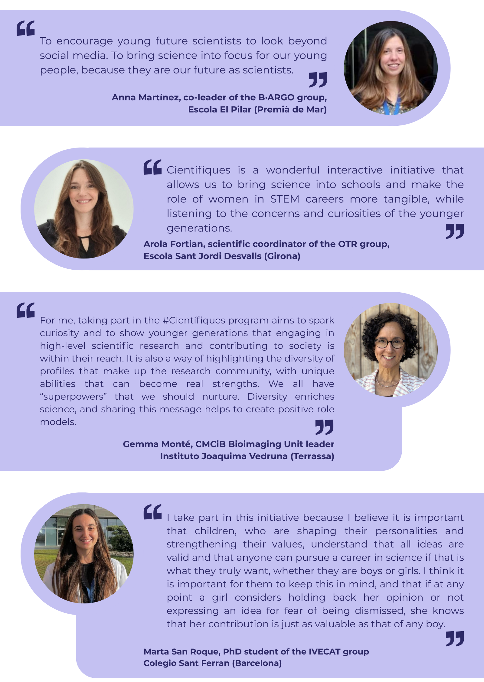 The main objective is to highlight the contribution of women in science and technology, as well as to create real and relatable role models of women in STEM disciplines (Science, Technology, Engineering and Mathematics) that can inspire students and awaken interest in these fields of knowledge. In this 8th edition, about 600 scientists from public and private research entities around Catalonia have offered talks to about 40,000 students from 6th grade and 1st ESO in 530 educational centres throughout the territory. These talks, the result of a process of collaboration and joint work between researchers and schools, address the life, career path and professional work of each of the #científiques.