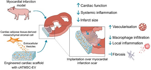 En el seu últim estudi, publicat recentment a Theranostics, demostren com la implantació d'un bioimplant carregat de vesícules extracel·lulars de cèl·lules mare mesenquimals pot millorar la funció cardíaca en un model porcí d'infart agut de miocardi. "Hem pogut veure que les vesícules extracel·lulars redueixen la inflamació del miocardi postinfart, afavoreixen l'aparició de nous vasos sanguinis i disminueixen el remodelat advers que fa el cor per adaptar-se a la pèrdua de capacitat muscular", comenta la primera autora de l'article, la Dra. Marta Monguió-Tortajada. "Les vesícules tenen moltes de les propietats de les cèl·lules mare mesenquimals, i tenen certs avantatges en evitar riscos de rebuig de trasplantament i més estabilitat per no ser entitats vives". El grup ha comptat amb la col·laboració del grup REMAR-IVECAT, liderat pel Dr. Francesc E Borràs, expert en l'aïllament i caracterització de les vesícules extracel·lulars.