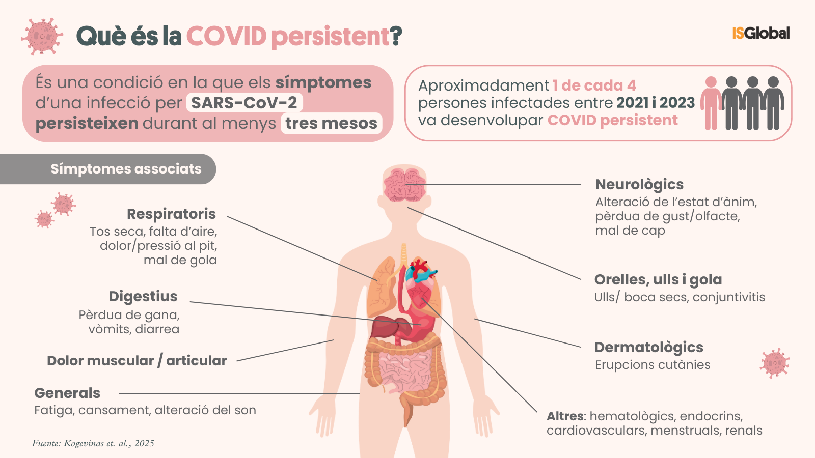 Després de superar una infecció inicial per SARS-CoV-2, algunes persones desenvolupen COVID persistent. Es manifesta amb símptomes que persisteixen durant almenys tres mesos, incloent-hi símptomes respiratoris, neurològics, digestius o generals, com ara fatiga i esgotament. La majoria dels estudis sobre COVID persistent s'han dut a terme en un context clínic, el que pot no reflectir completament el seu impacte en la població general.
