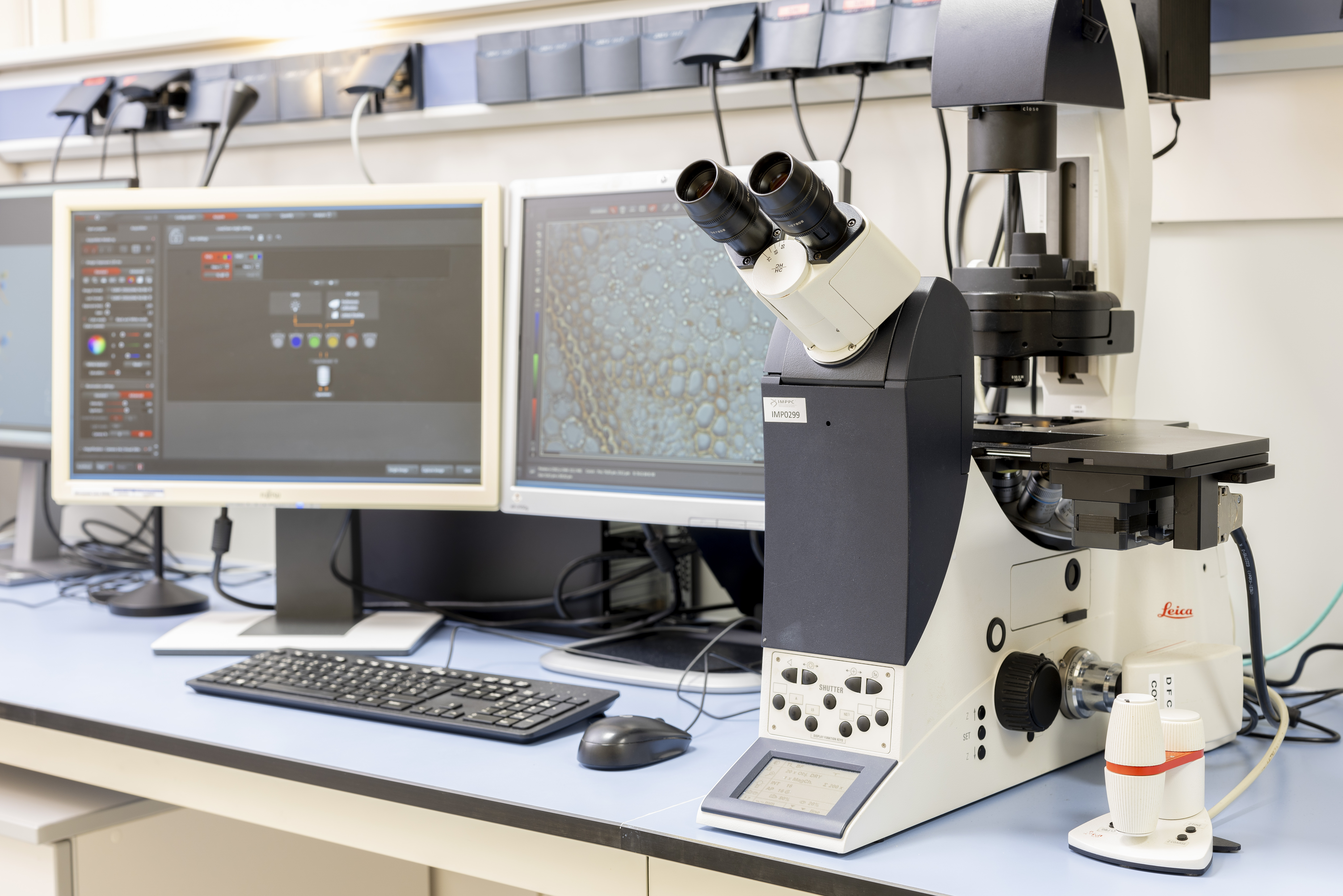 Microscopi invertit de camp ampli Leica DMI6000 B totalment motoritzat per a imatges de camp clar i fluorescència amb jocs de filtres de fluorescència per a fluorocroms excitats per llum ultraviolada, blava i taronja, així com objectius secs 4x, 10x, 20x, 40x i objectiu d'oli 63x. El microscopi està acoblat a una càmera en color Leica DFC420 de 5 MP i a una monocroma DFC360 de 1,4 MP, i utilitza el programari Leica LAS X per obtenir i analitzar imatges.