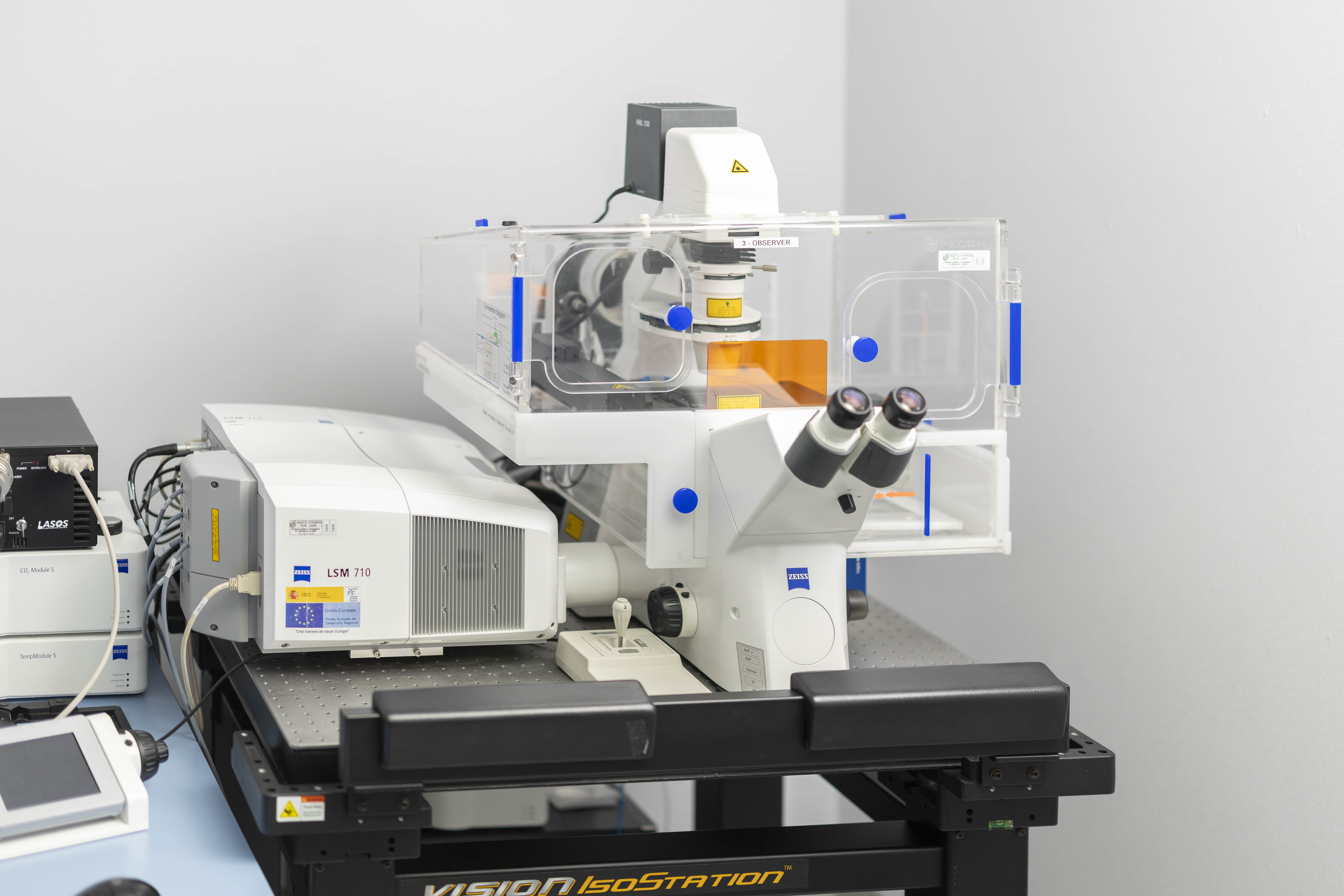 Mòdul confocal Zeiss LSM 710 acoblat al microscopi Zeiss Axio Observer Z1 equipat amb 7 feixos làser (405nm, 458nm 488nm 514nm 543nm, 594nm, 633nm) així com objectius secs 3x i programari ZEN black 2012 per obtenir i analitzar imatges.