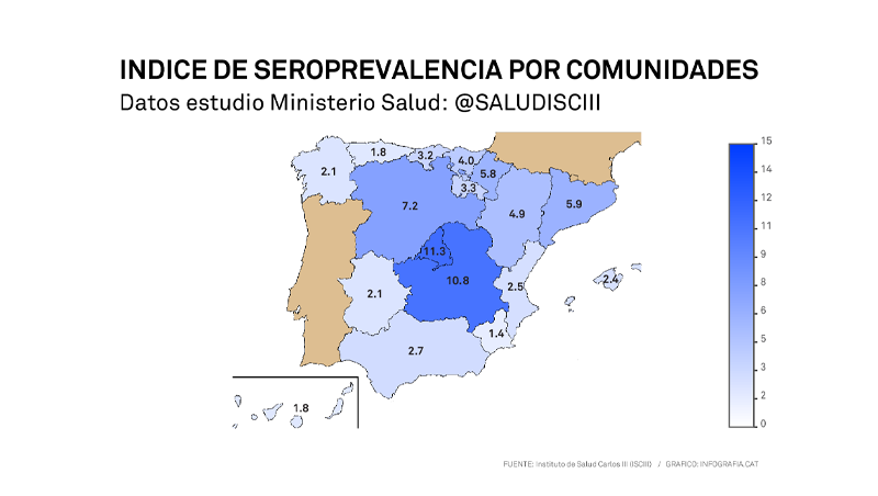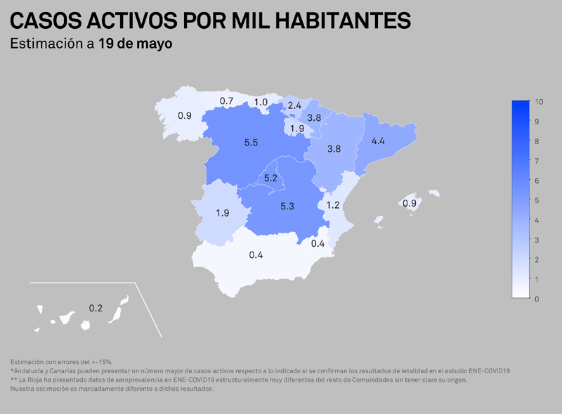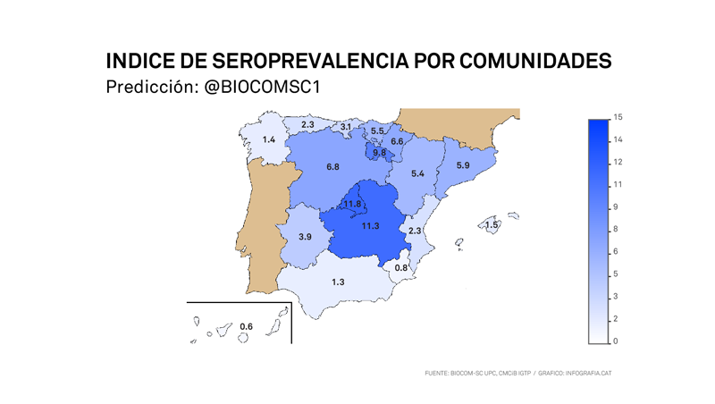 The prediccions produced by the researchers Martí Català of the IGTP, and Enric Alvarez and David Pino of the Computational Biology and Complex Systems research group (BIOCOM-SC) of the Universitat Politècnica de Catalunya · BarcelonaTech (UPC) has been able to calculate the active cases per autonomous region and how many people would actually have the disease. The data shown in the following table indicate that the autonomouis regions with more active cases continue to be Madrid (with 35,000 active cases, 28% of the total) and Catalonia (with 34,000 active cases, 27% of the total), followed by Castile-León (13,000 active cases) and Castile La Mancha (11,000 active cases). On the other hand, the Canary Islands (500 active cases), Cantabria (600 active cases), La Rioja (600 active cases), Murcia (600 active cases) and Asturias (700 active cases) would be the autonomous regions with the lowest figures.