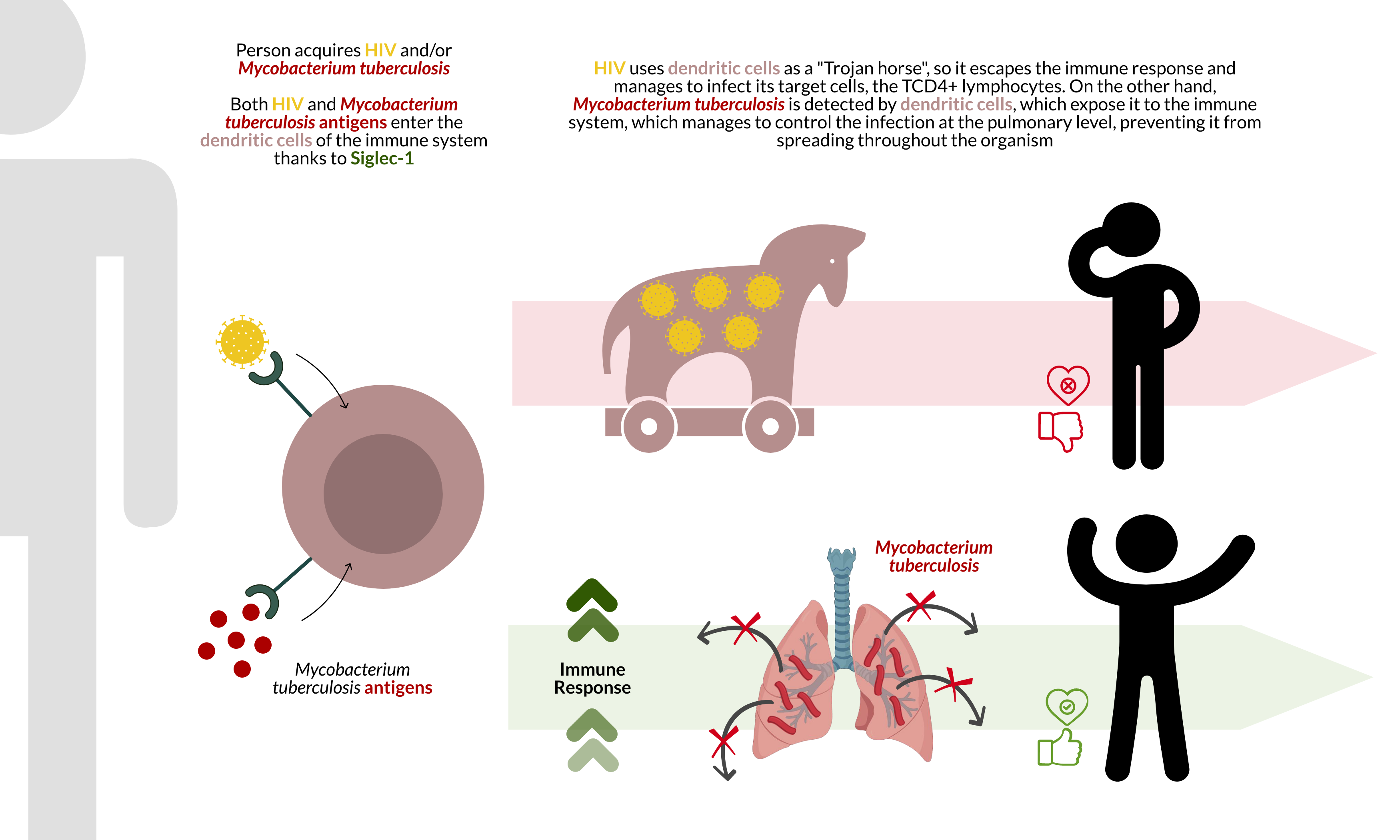 The fact that HIV's target cells are TCD4+ lymphocytes causes the virus to weaken the immune system. With a weakened immune system, opportunistic pathogens such as Mtb have it easier to infect, which is why HIV/Mtb co-infection is common.