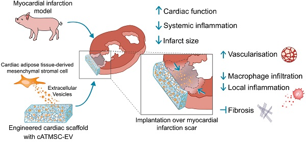 In their latest study recently published in Theranostics, they have demonstrated that an implant carrying extracellular vesicles from mesenchymal stem cells can improve cardiac function in a porcine model of myocardial infarction (heart attack). "We have seen that the extra-cellular vesicles reduce the inflammation resulting from the heart attack, favour the appearance of new blood vessels and reduce the adverse remodelling, which the heart undergoes to adapt to the loss of muscle capacity," says the lead author of the paper, Marta Monguió-Tortajada. "The vesicles have many of the properties of the stem cells and certain advantages, such as avoiding transplant rejection and they are more stable, as they are not living cells." The work was a collaboration with the REMAR-IVECAT Group, led by Francesc Borràs, expert in isolating and characterizing extra-cellular vesicles.