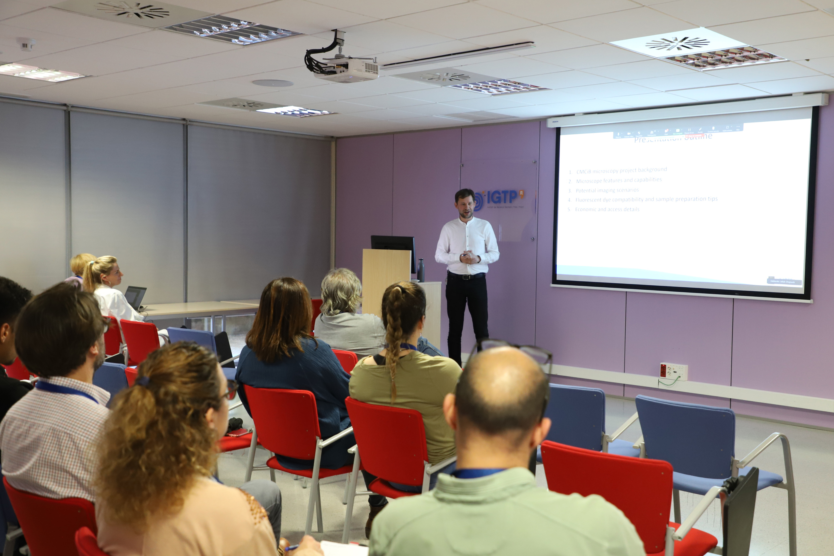 On May 10, a state-of-the-art super-resolution fluorescence confocal microscope, called Abberior Infinity, was installed in the high-level biosafety (NCB3) facility of the Centre for Comparative Medicine and Bioimage (CMCiB) of the Germans Trias i Pujol research Institute (IGTP). Today, as part of the CMCIB 3RS training programme, this new equipment was introduced in the seminar Introduction to the CMCiB NCB3 super-resolution microscope: from molecular imaging to animal tissue imaging, conducted by Jakub Chojnacki, Head of the Microscopy Service at the IGTP.