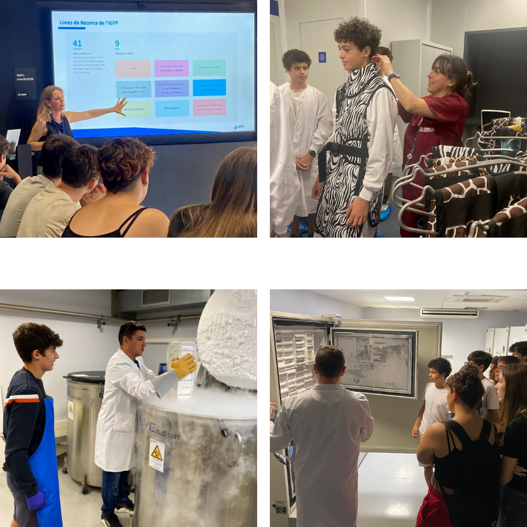 The event began with a presentation of the centre, led by Carol Gálvez, coordinator of IGTP’s scientific-technical platforms. Subsequently, the students were divided into two groups to visit various scientific platforms and spaces at the Centre for Comparative Medicine and Bioimaging of Catalonia (CMCiB), where the heads of Translational Genomics, Cytometry, and Cryobiology showed them the instruments used by researchers to detect, preserve, and observe cells.