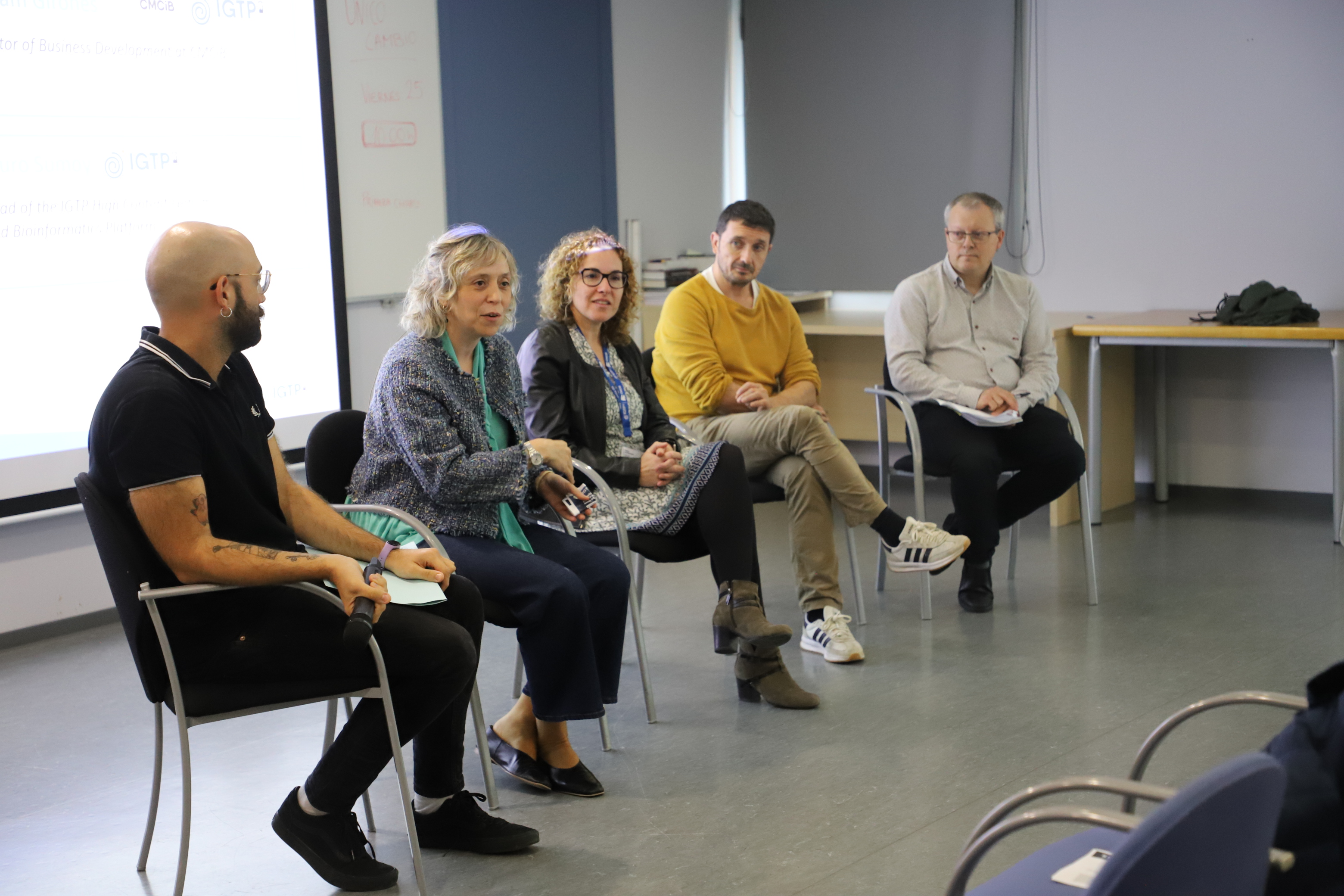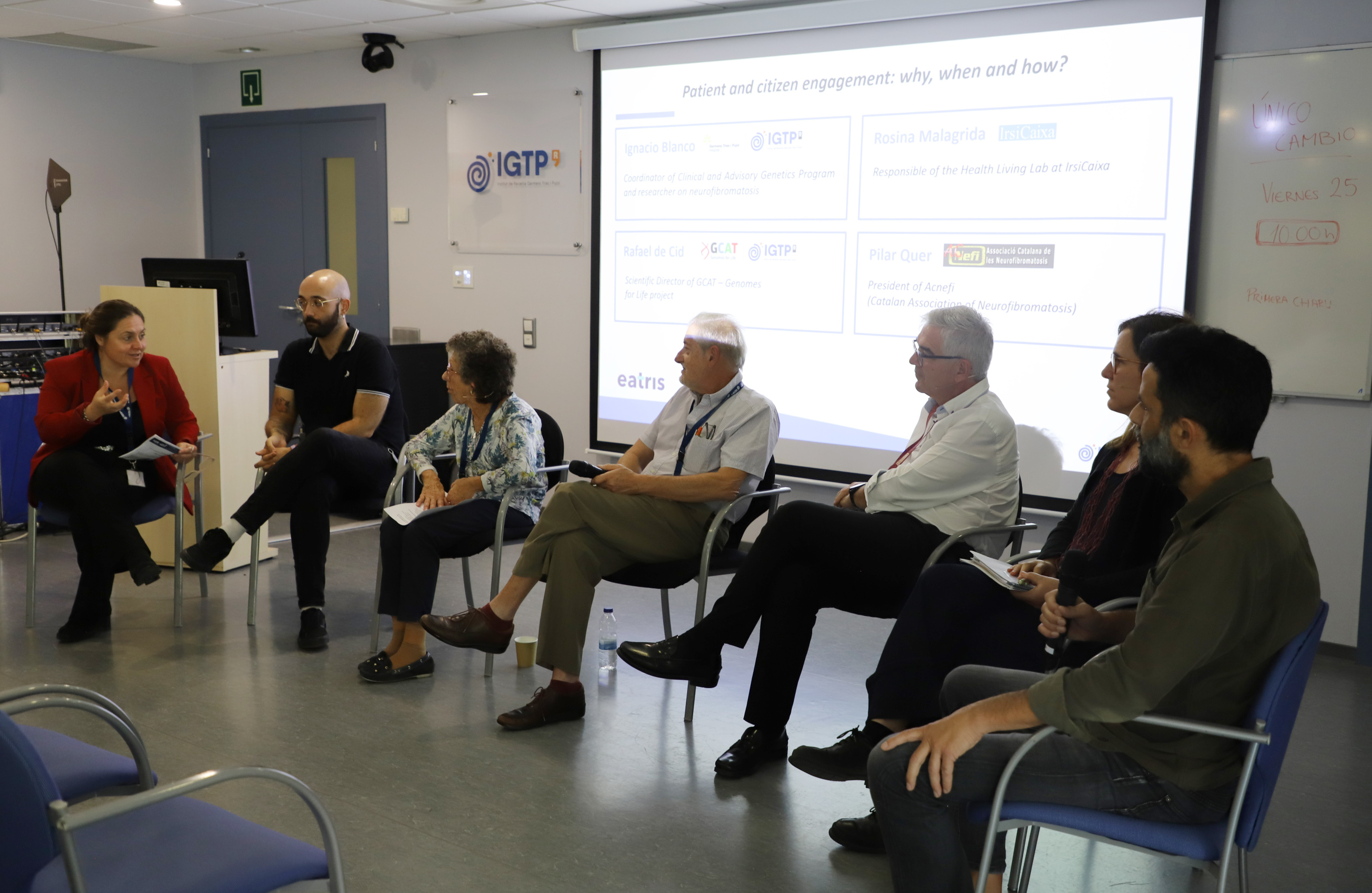 The symposium concluded with a round table discussing the role of patients and citizens in biomedical research, exploring the most effective timing and methods to involve them, and the importance of doing so. Chaired by Laura García Bermejo, the panel featured contributions from Ignacio Blanco, clinical director at Laboratori Clínic de la Metropolitana Nord and coordinator of the Clinical and Advisory Genetics; Rosina Malagrida, responsible of the Living Lab at IrsiCaixa; Rafael de Cid, scientific director of IGTP's GCAT|Genomes for Life project; and Pilar Quer, president of Associació Catalana de les Neurofibromatosis (AcNefi).