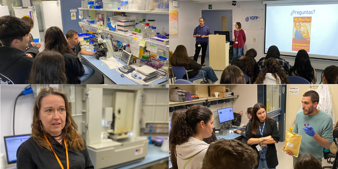 IGTP hosted five student groups. Some visited cancer research laboratories from ICO and IGTP's CARE program, as well as infectious disease research laboratories, accompanied by researchers from B·ARGO, Cancer Genetics and Epigenetics (CGE), PvREX, and the Innovation in Respiratory Infections and Tuberculosis Diagnostics group. Others participated in a bioinformatics workshop led by the Hereditary Cancer research group. The final two groups explored the Comparative Medicine and Bioimage Centre of Catalonia (CMCiB) and the Biobank scientific-technical platform.