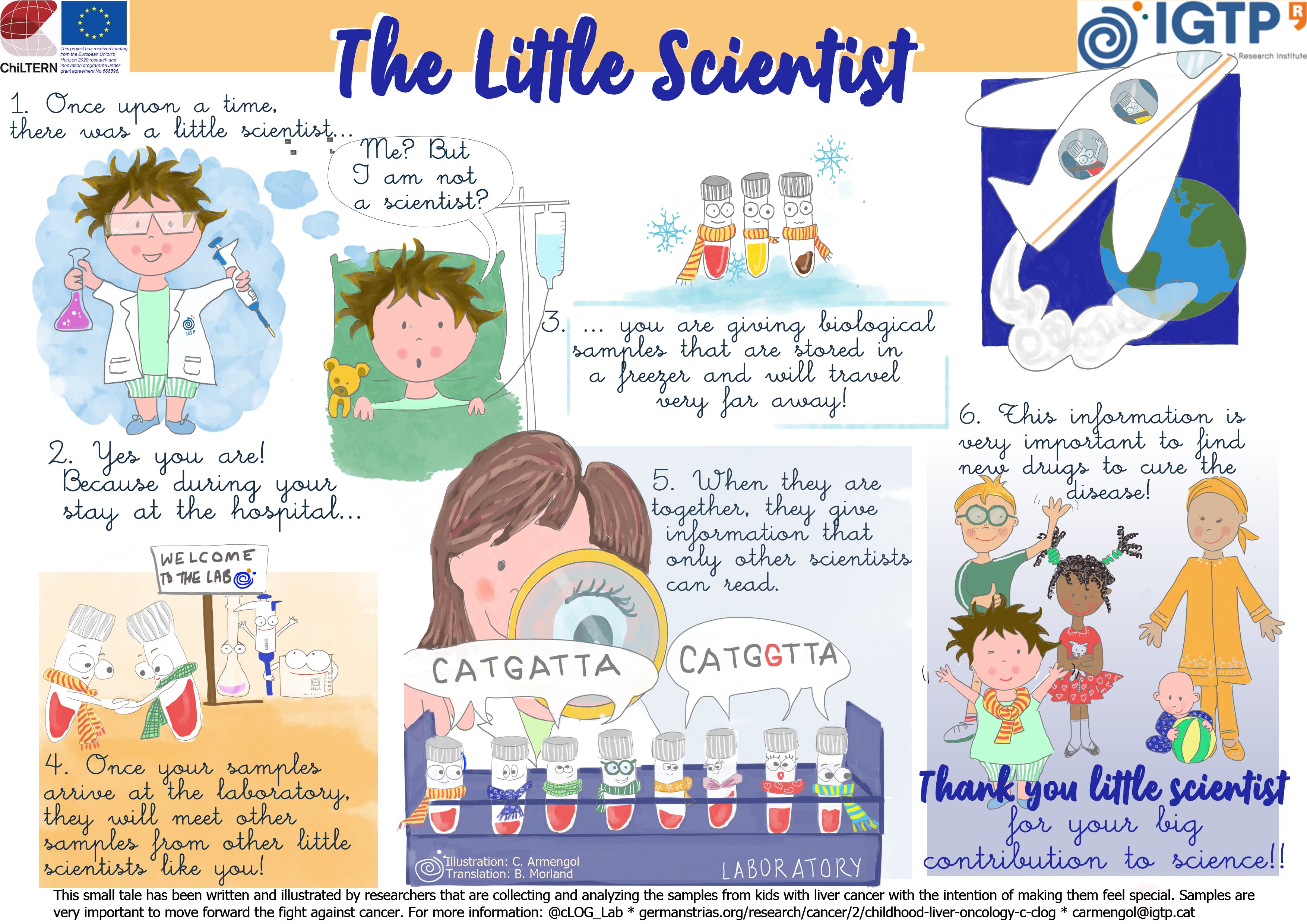 "The Little Scientist" is a small tale written and illustrated to learn about the important role of children with liver cancer in c-LOG's research. It is meant for families and patients with liver cancer. Translations into Spanish, Catalan, French and Polish are on their way!