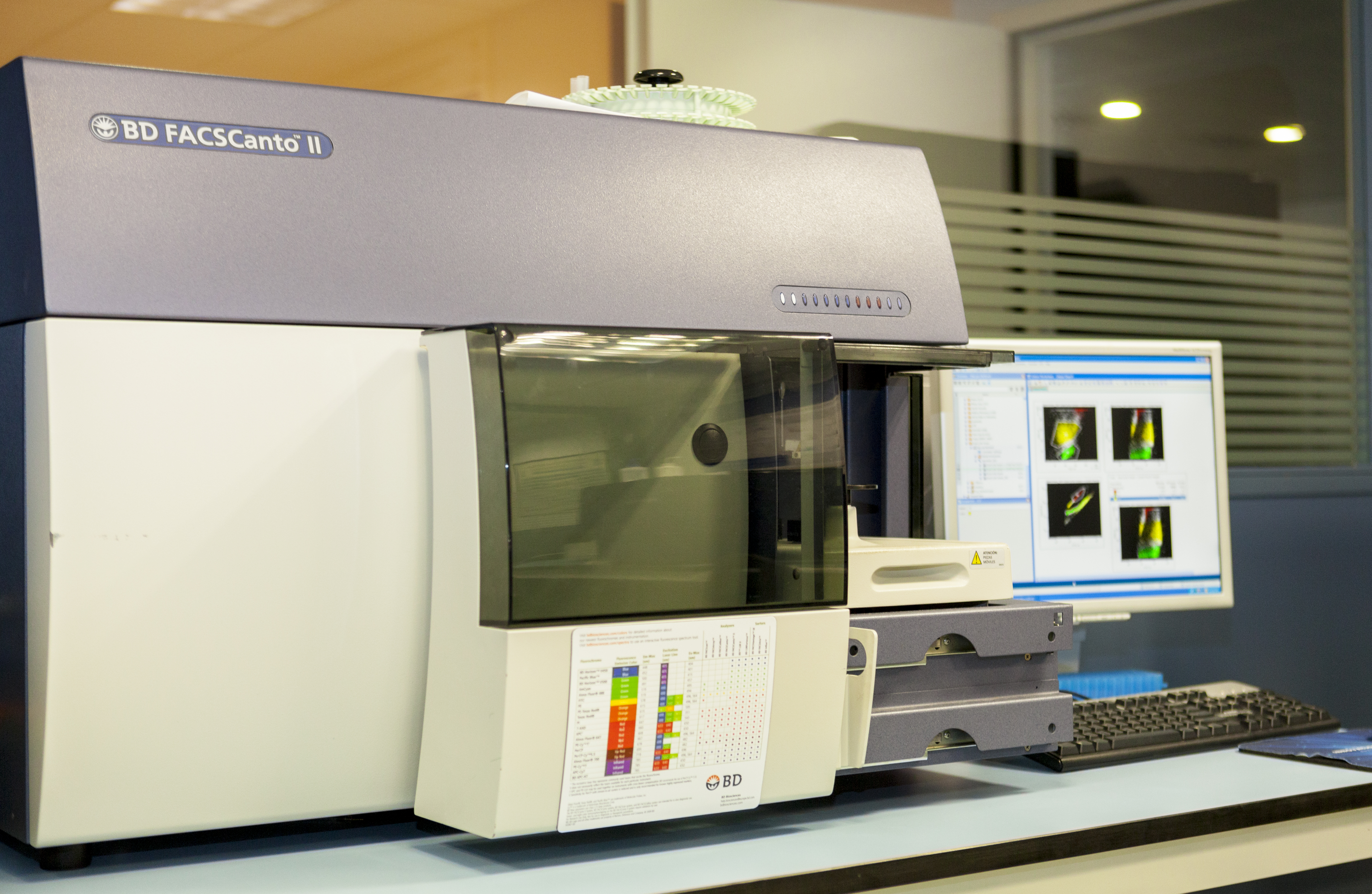 Equipped with solid state blue laser (488nm), red laser He-Ne (640 nm), violet laser (405 nm) and green laser (532 nm) this machine allows you to work with 18 fluoresences and 2 scatter parameter (FSC and SSC) analysing area, height and width of pulse for each one. Digital system processing system with software FACSDiva. HTS system for acquiring samples in 96 well plates.