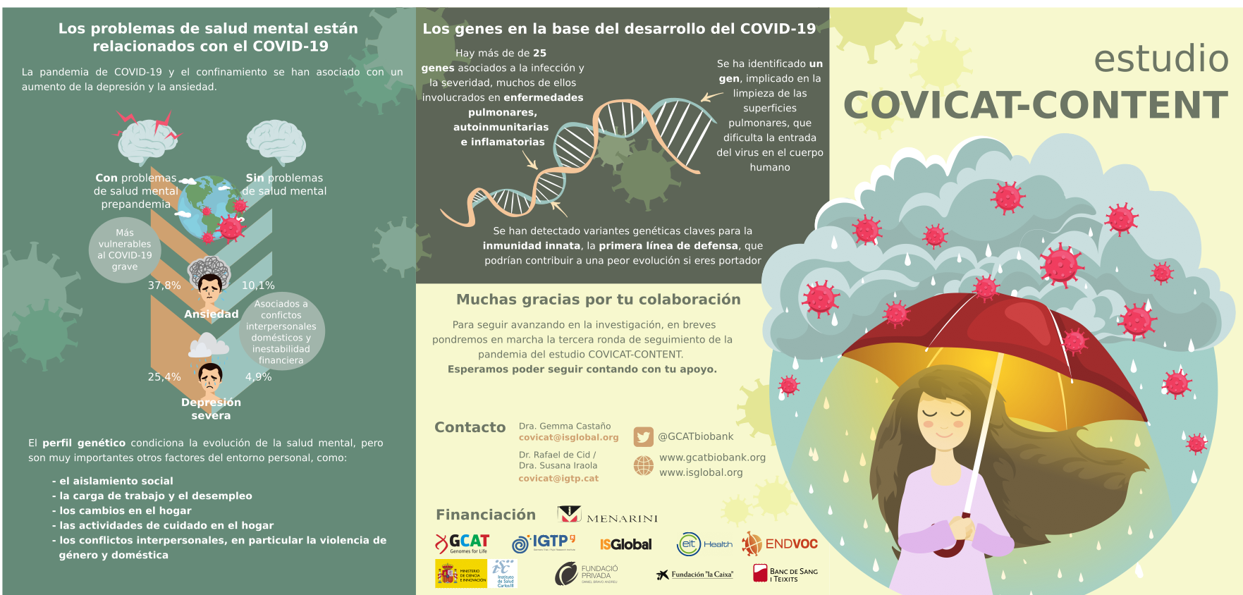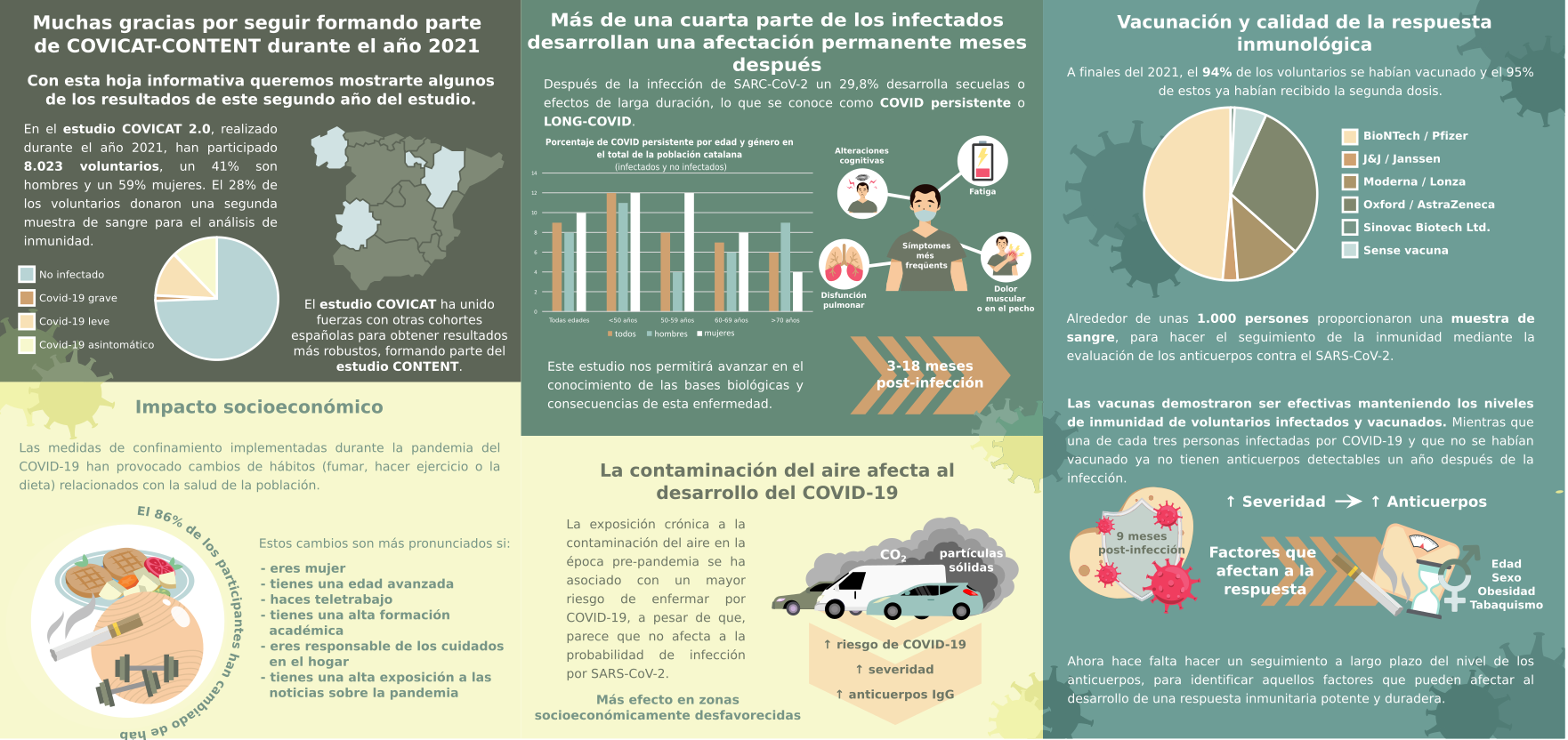 El estudio previo COVICAT-CONTENT del año 2021 aportaba nuevo conocimiento sobre las bases biológicas y las consecuencias de la COVID-19. En cuanto a la genética de la enfermedad, los científicos identificaron varias variantes clave por la inmunidad innata y genes asociados con la infección, la gravedad o la eliminación del virus. También estudiaron factores externos para ver su efecto en el riesgo de enfermar, en la salud mental y en el cambio de hábitos a raíz de las medidas de confinamiento.