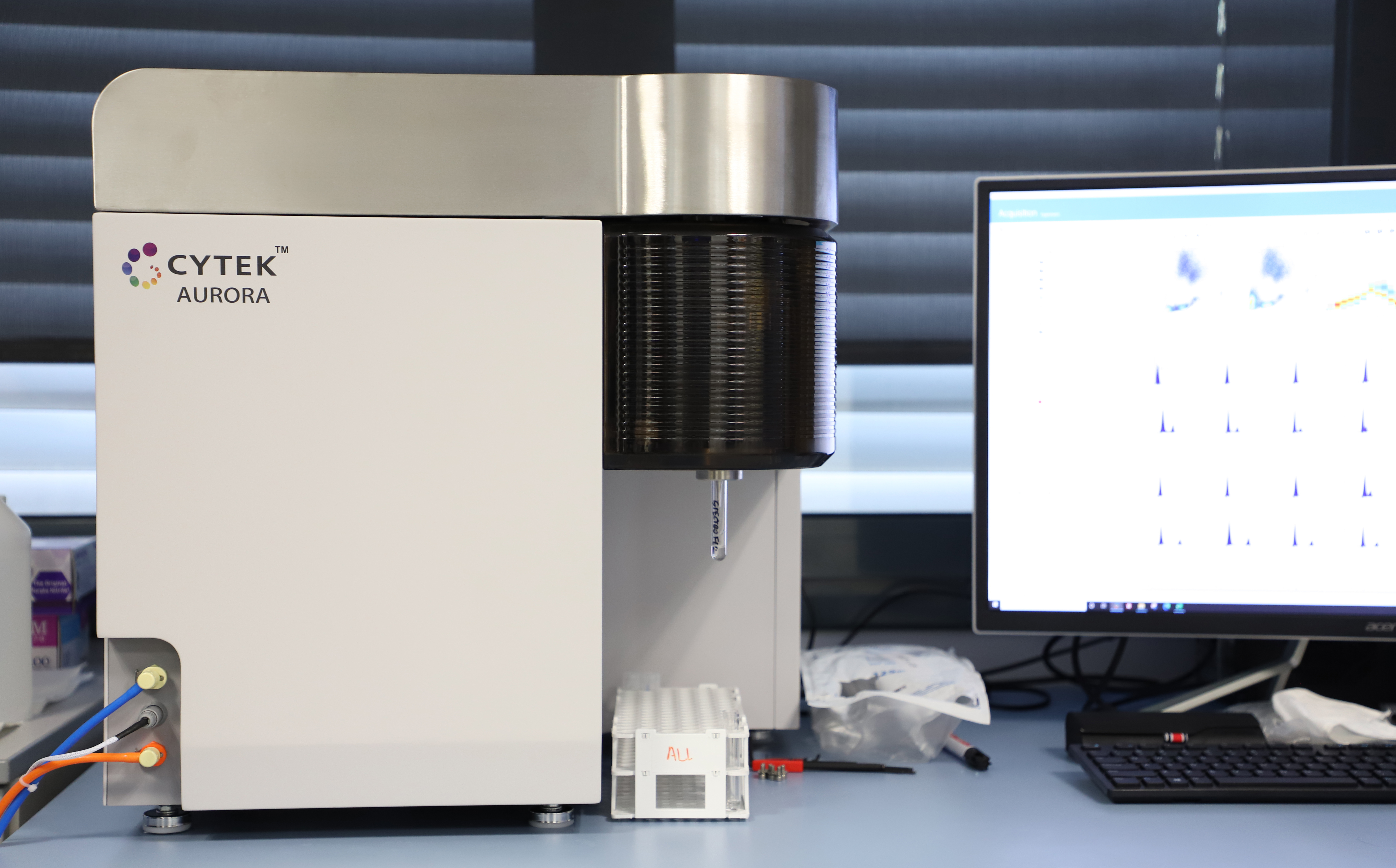 Instalado en mayo de 2020, está configurado con cinco láseres (355, 405, 488, 561 y 640 nm), tres parámetros de dispersión y 64 canales de fluorescencia. Aurora permite datos de alta dimensión con paneles diseñados (40 colores simultáneamente y más allá). Equipado con sistema automático de micro-muestreo (AMS) para la adquisición de alto rendimiento con placas de 96 pocillos. Análisis de datos con el software SpectroFlo para diferenciar datos raw data espectrales.