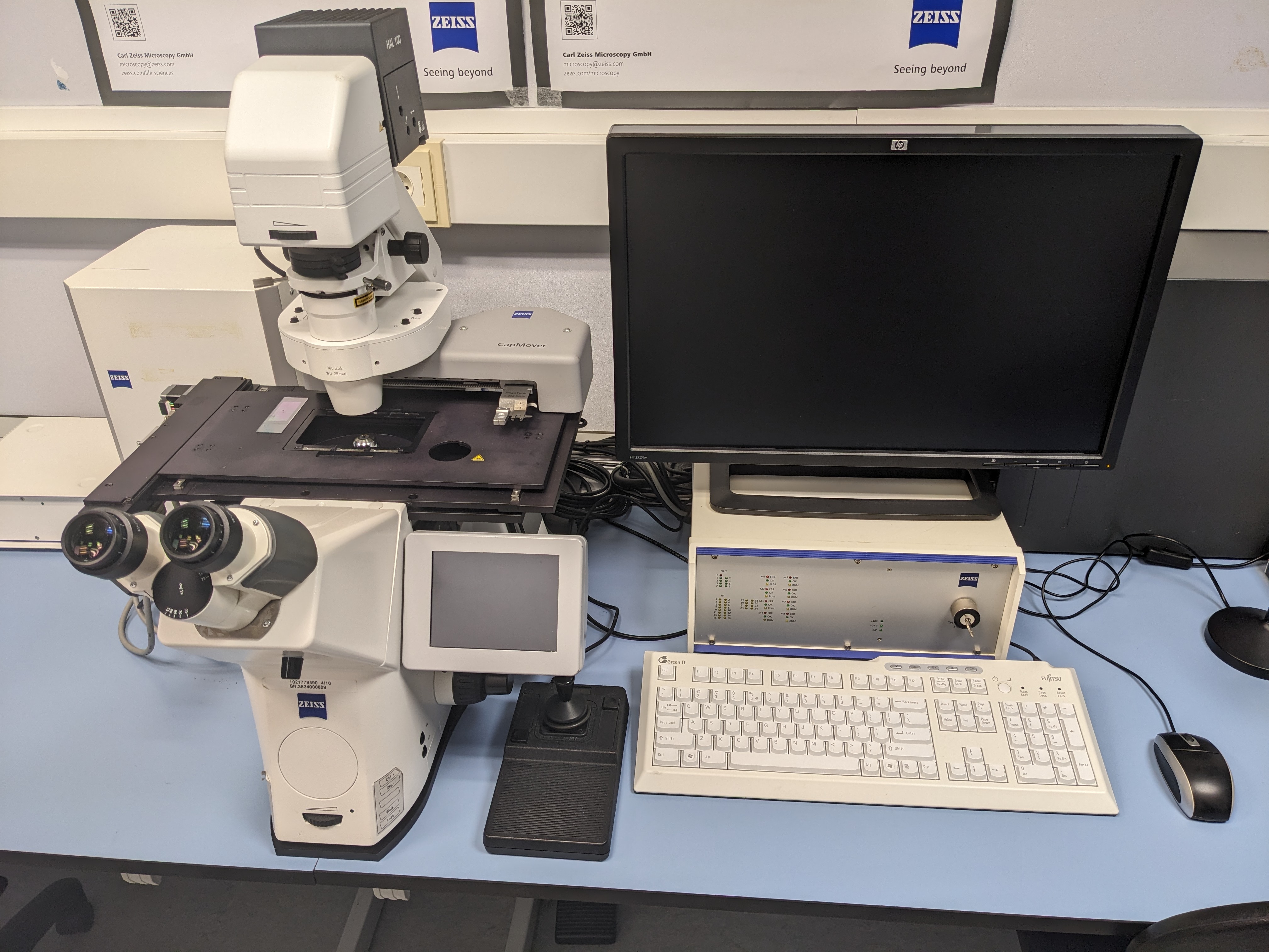 Microscopio invertido de campo amplio Zeiss Axio Observer Z1 para imágenes de campo claro y epifluorescencia con juegos de filtros de fluorescencia para fluorocromos excitados por luz UV, azul y naranja, así como objetivos secos de 10x, 20x y 40x y objetivos de aceite de 40x y 63x. El microscopio está acoplado a Zeiss AxioCam MRm 1.4 MP monocromo y utiliza el software ZEN blue 2012 para la obtención y análisis de imágenes. Para estudios de imagen de células vivas, el microscopio está equipado con una cámara de incubación (completamente cerrada) con una unidad de calentamiento modular para placas de Petri, portaobjetos de microscopio, y placas de 24 pocillos y regulación de la temperatura y del entorno de CO2.
