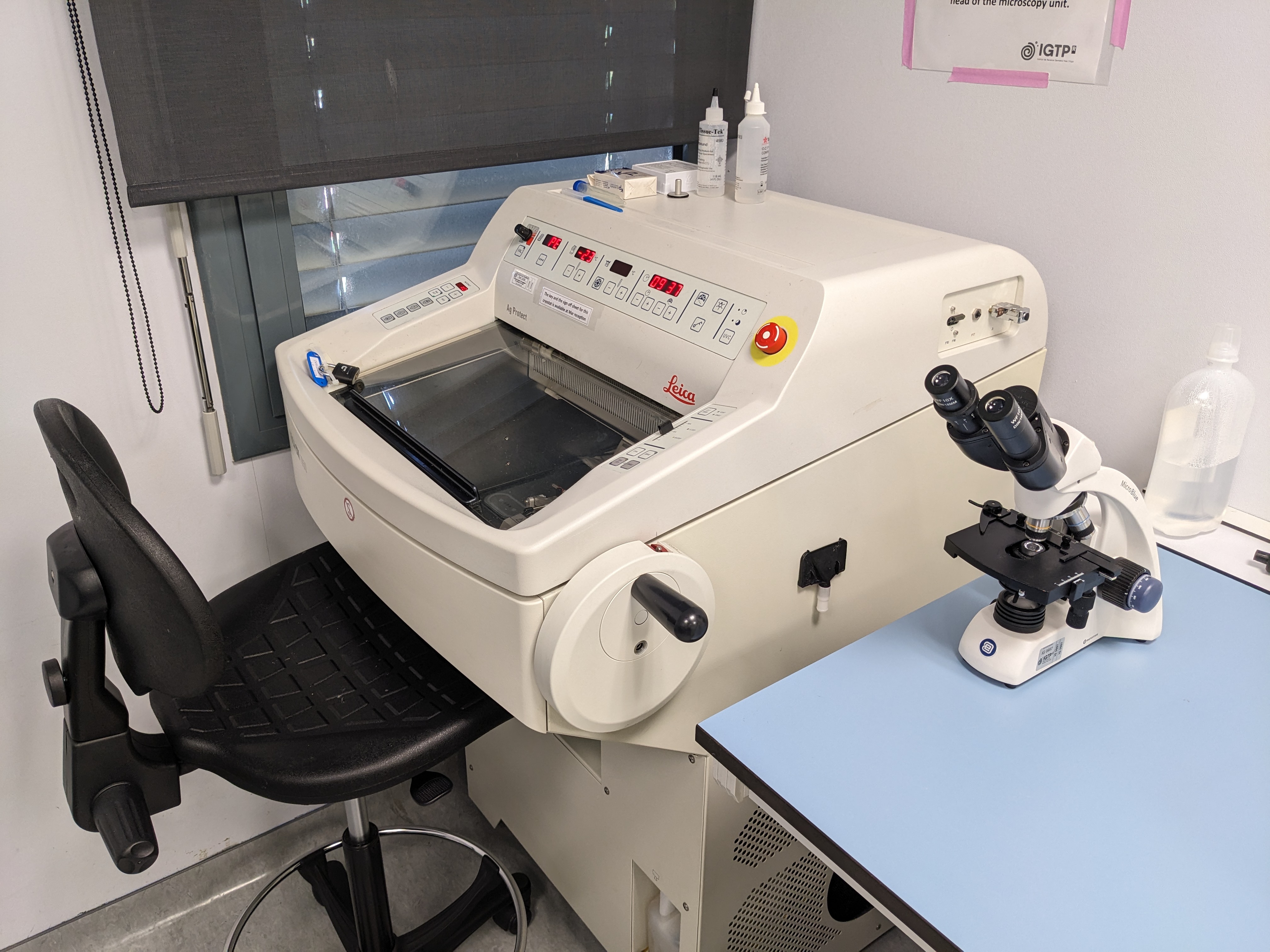 Micrótomo criostático Leica CM1950 con desinfección UVC y sistema Ag-protect para la manipulación de muestras potencialmente peligrosas. El criostato es semiautomático con 15 posiciones de placa, rango de temperatura de trabajo de 18 °C a -42 °C, congelación rápida de muestras a -52 °C y sistema de lavado al vacío para reducir la manipulación directa de las muestras.