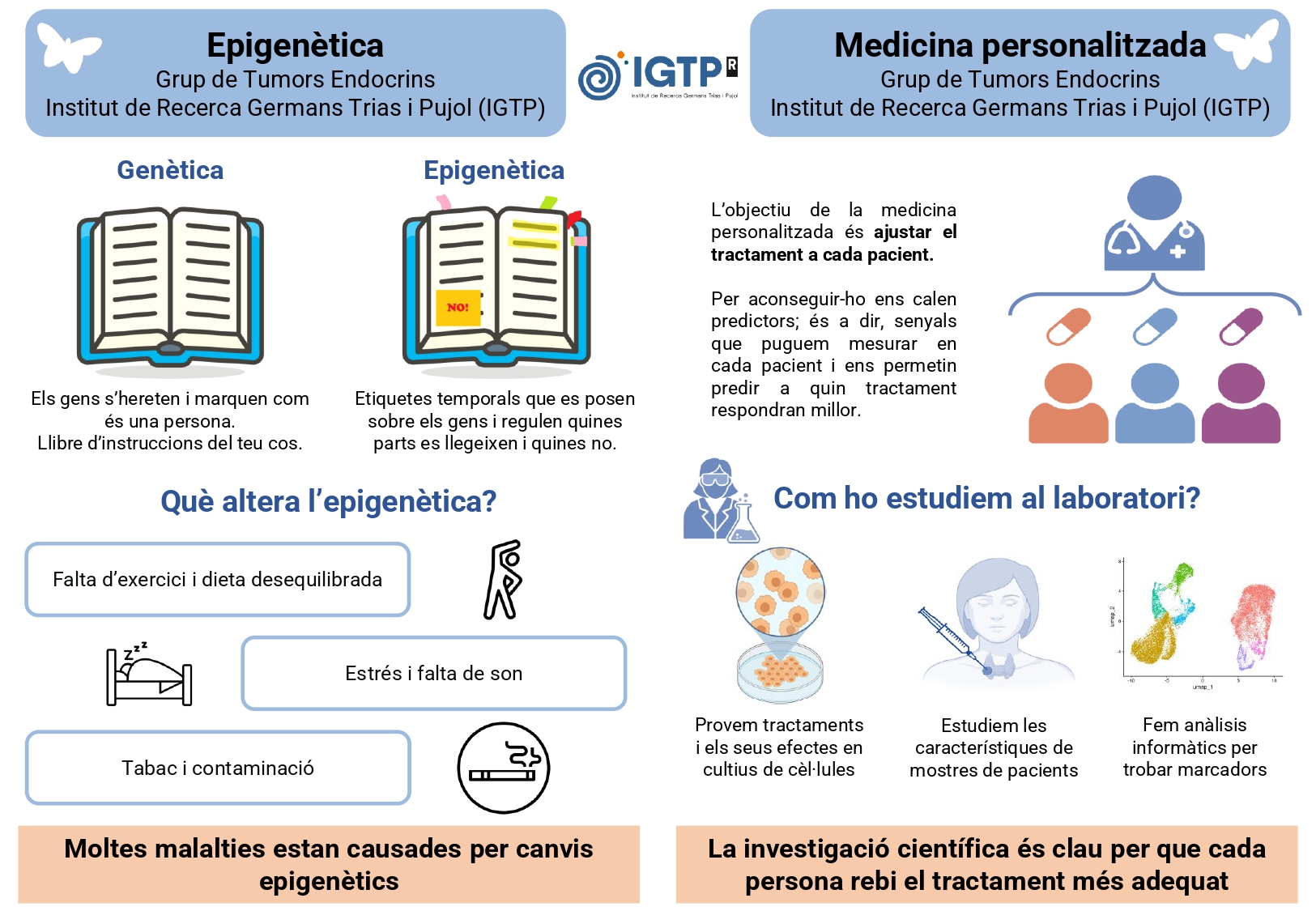 A càrrec d'Anna Rueda i Paula de Pedro, del grup de Tumors Endocrins (E.T.), el taller ha introduït els participants en conceptes de medicina personalitzada i epigenètica. A partir d'exemples pràctics, els alumnes han pogut entendre com els gens i els factors ambientals influeixen en el desenvolupament de malalties i com la recerca busca adaptar els tractaments a cada pacient.